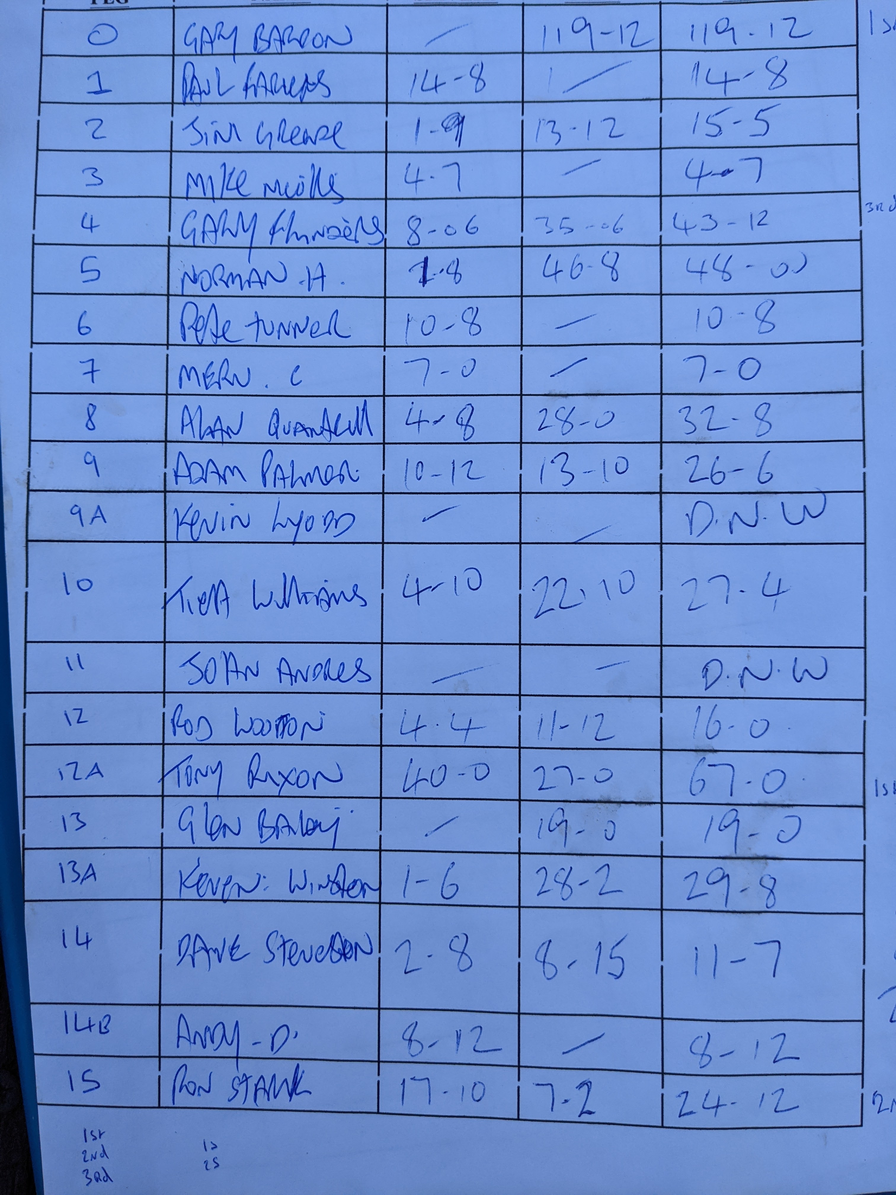 Top silvers.was taken by ray white on peg 41 with 21lb of mainly small crucians, weigh sheets below, off to shiplate tomorrow for number 2, 42 fishing over three lakes, looking at the forecast a nice sheltered peg out of the wind will do me, unfortunately joe mcmahon wont be there so i will have to draw my own flyer.